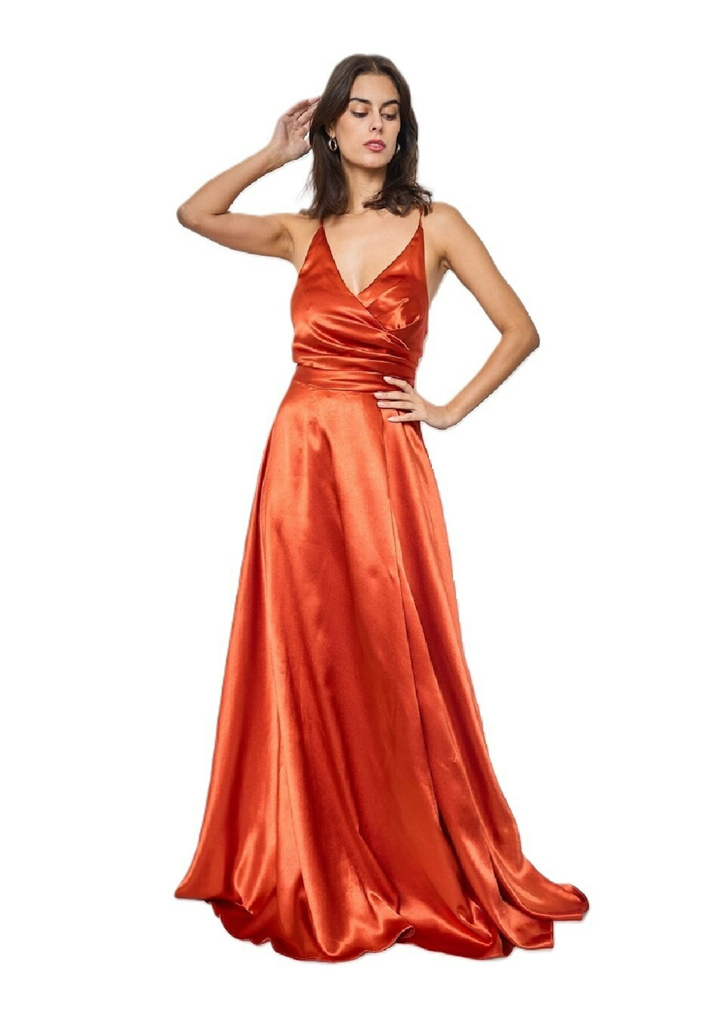 Oranje satijnen galajurk met split - Copy